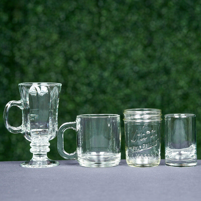 Wine Glasses Beer Glasses Rocks Glasses Dessert, Soda & Punch Glasses Martini & Snifter Glasses Hi Ball & Zombie Glasses Shot, Liqueur & Port Glasses Multicolor Glass Goblets & Tumblers Specialty & Color Glasses Mason Jar, Juice, coffee glasses