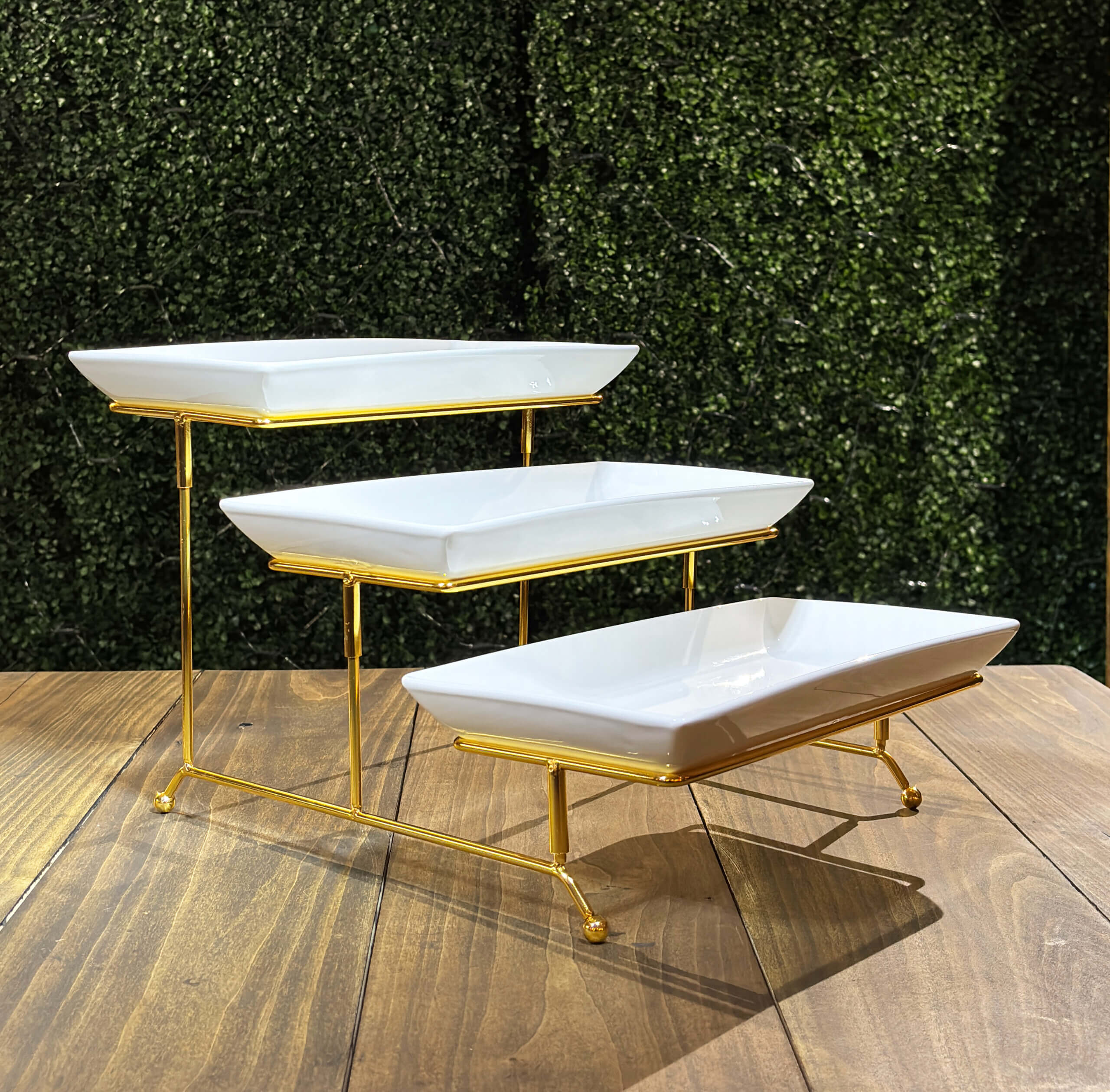 Three 12″ x 6″ trays on 3 gold risers.