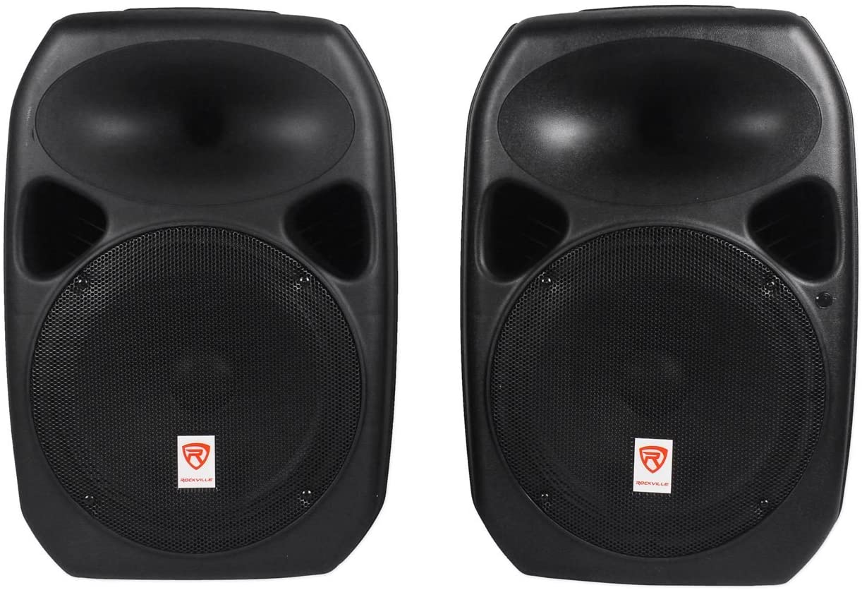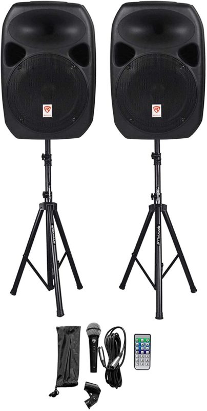 Dual 12″ powered speakers, Bluetooth + Microphone + speaker stands + all cables.